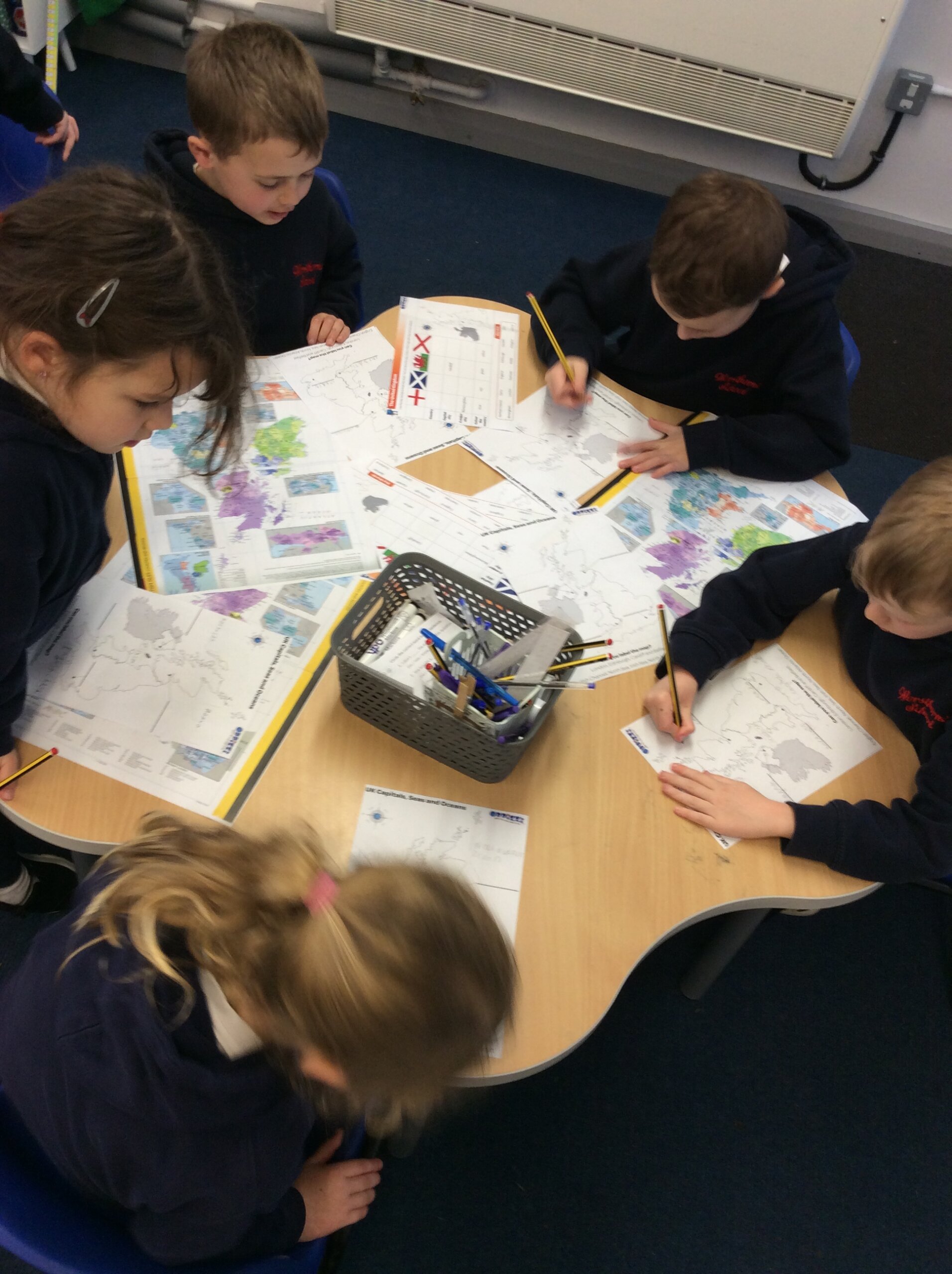 Children used maps to identify continents and oceans.